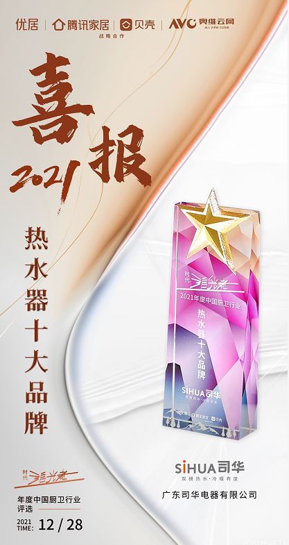 為致敬新一代廚衛(wèi)行業(yè)追光者,騰訊家居 | 貝殼廚衛(wèi)頻道聯(lián)合優(yōu)居、奧維云網(wǎng)(AVC)共同舉辦“2021年度中國(guó)廚衛(wèi)行業(yè)評(píng)選活動(dòng)”,通過(guò)線上投票方式,向廚衛(wèi)電器行業(yè)優(yōu)秀品牌致敬,用媒體力量,回顧2021年度廚衛(wèi)行業(yè)發(fā)展歷程,傳達(dá)企業(yè)心聲。 經(jīng)過(guò)多日激烈的投票角逐,司華憑借其企業(yè)多年筑建的護(hù)城河,多次刷新熱水器行業(yè)高度。最終,與能率、萬(wàn)和、海爾等一眾優(yōu)秀品牌共同獲得“2021年度中國(guó)廚衛(wèi)行業(yè)年度熱水器十大品牌榮譽(yù)”,飲譽(yù)而歸。