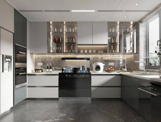 煥新裝廚房 LED24-R1+4平博美大板吊頂 廚房整體是“U”形設(shè)計(jì),大板吊頂結(jié)合電器,完美隱藏,做飯動(dòng)線非常流暢,環(huán)境整潔。