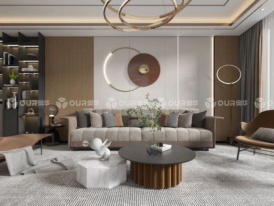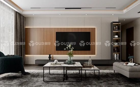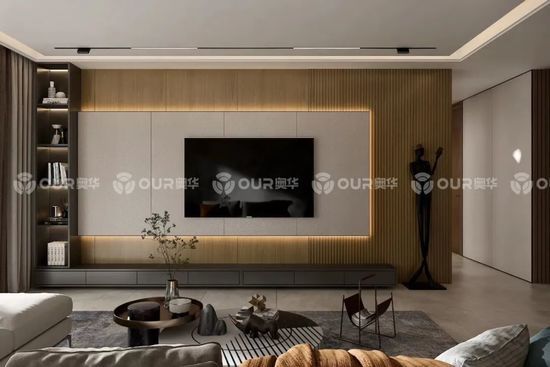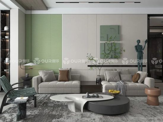 奧華松綠背景墻+布拉格皮紋,清雅的灰調(diào),在蜿蜒在綠意中,為客廳舒展出一種靜謐的高級感,用精致的細節(jié)之美,演繹美妙休閑時光,讓笑聲伴著家人回憶更多幸福時光。