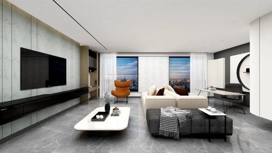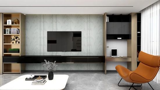 ▲JC027-2 客廳的設(shè)計(jì)同時(shí)考慮到了美觀性和實(shí)用性。電視柜懸空,清掃起來更方便。背景墻兩側(cè)做收納的同時(shí)做了一個(gè)小辦公臺(tái)。吊頂采用燈帶的手法,把現(xiàn)代風(fēng)格的元素融入進(jìn)去。