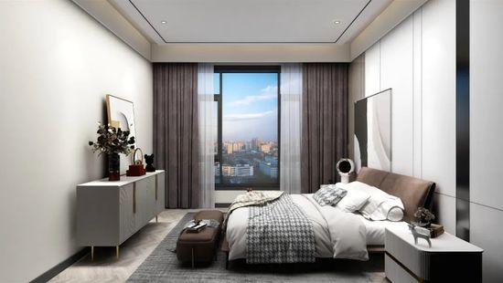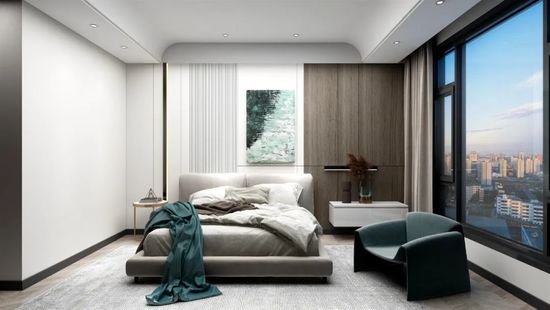 ▲TE017-5 主臥用乳白色的墻布和棕色墻板相結(jié)合,搭配周圍的軟裝布置,營(yíng)造出了一種安逸、靜謐的居住環(huán)境。擺放在兩側(cè)的藝術(shù)臺(tái)燈,讓簡(jiǎn)約的空間增加了一絲藝術(shù)氣息。