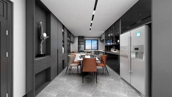 ▲B05-2 餐廳和廚房采用了當(dāng)下流行的開放式布局。兩側(cè)墻面收納空間充足,質(zhì)樸天然的石材地磚、干練簡(jiǎn)約的餐桌,圈畫出理性卻不乏溫馨的用餐空間。