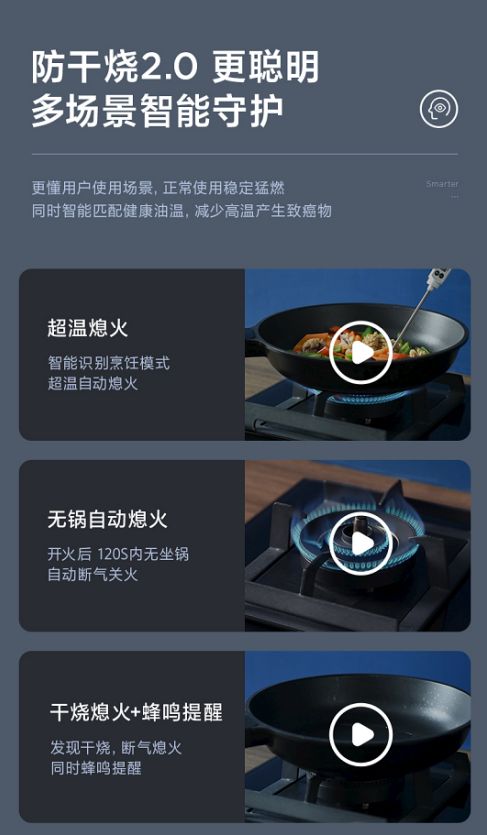 升級(jí)防干燒2.0,全方位守護(hù)爸媽烹飪安全 日常烹飪生活中,很多人難免因?yàn)橛惺码x開(kāi)廚房一會(huì),而忘記關(guān)燃?xì)庠?,出現(xiàn)燒干鍋、燒糊鍋的情形。比如我們的父母日漸年邁,記憶力逐漸衰退,可能僅僅是接個(gè)電話的功夫,就忘記了鍋里的飯菜,經(jīng)常性忘記關(guān)灶具,會(huì)帶來(lái)很大的火災(zāi)隱患風(fēng)險(xiǎn)。據(jù)統(tǒng)計(jì)近年來(lái),我國(guó)共發(fā)生居住場(chǎng)所火宅132.4萬(wàn)起,其中電氣火災(zāi)占42.7%,傷亡群體中60歲以上的占43.4%,爸媽就是處于這樣的年齡段,因此,廚房安全不容忽視。