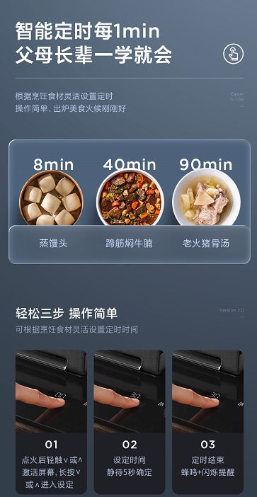 此外,它還支持多場(chǎng)景智能識(shí)別烹飪模式,在超高溫度下會(huì)自動(dòng)熄火;開(kāi)火后,120S內(nèi)無(wú)坐鍋,會(huì)自動(dòng)斷氣關(guān)火;發(fā)現(xiàn)干燒情況,會(huì)立即斷氣熄火,同時(shí)會(huì)蜂鳴提醒用戶,讓爸媽輕松下廚,無(wú)需后顧之憂。 智能定時(shí),輕松下廚更省心 傳統(tǒng)烹飪,我們需要寸步不離的在灶具前盯著菜肴、火候,不僅浪費(fèi)時(shí)間,而且需要及時(shí)調(diào)節(jié)火候,操作也比較繁瑣。