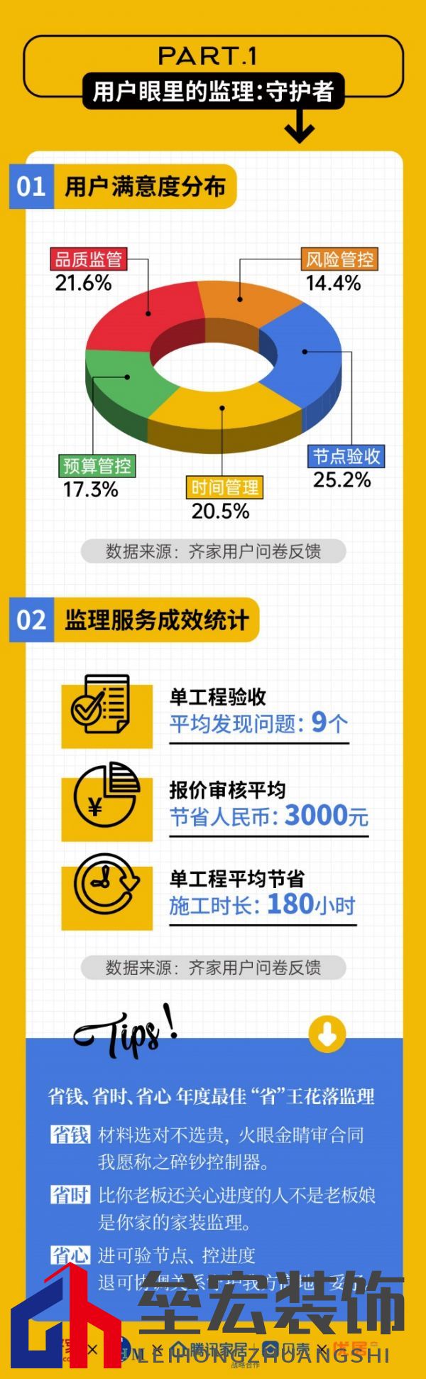 “裝修找監(jiān)理要花錢”,這可能是大多數(shù)人最為樸素的認(rèn)知,但是你如果告訴他找監(jiān)理能省錢,他或許會(huì)認(rèn)為你在忽悠他。但事實(shí)上,一個(gè)好的第三方監(jiān)理確實(shí)能在裝修中幫業(yè)主省錢,齊家網(wǎng)發(fā)布的“監(jiān)理報(bào)告”顯示,在報(bào)價(jià)審核服務(wù)上,單均節(jié)省了3000元。另一方面,使用監(jiān)理服務(wù)的優(yōu)勢(shì)不僅僅只是體現(xiàn)在省錢上,在施工質(zhì)量和效率方面也能得到很好的保障,“監(jiān)理報(bào)告”顯示,單工程驗(yàn)收平均發(fā)現(xiàn)問題是9個(gè),單工程平均節(jié)省施工時(shí)長(zhǎng)達(dá)到了180小時(shí),也就是說監(jiān)理確實(shí)能幫業(yè)主實(shí)現(xiàn)省錢、省時(shí)和省心的目的。