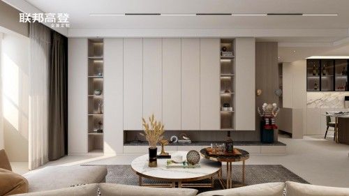 客廳舍去電視設計,整墻收納展示柜完美加持收納所需,打造精致而有序的家居空間。當夜幕降臨時,忍不住斟兩杯紅酒,與相愛之人圍坐在沙發(fā),共話私語卿卿。