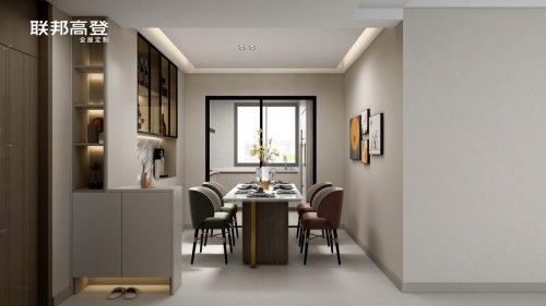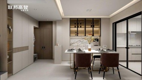 餐廚空間以透明玻璃門分隔,勾勒出不同區(qū)域屬性的隱形分界;半藏半露展示的餐邊柜,在柜內暖色氛圍燈帶的點綴下,營造出了格調十足的就餐儀式感。