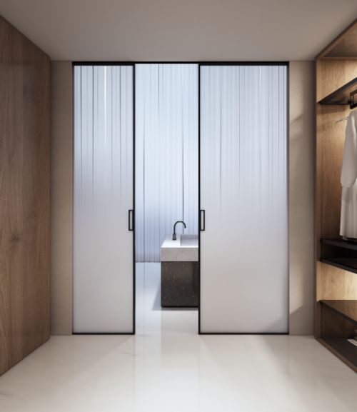 圍繞“自我”所展開(kāi)的衛(wèi)生間布置,與衣帽間連接起來(lái),打造精致利落、純粹自我的的理想衛(wèi)生間。選擇德立全景門(mén)(玻璃隔斷門(mén)),隱藏式設(shè)計(jì)將門(mén)“收”進(jìn)墻內(nèi)。朦朧柔和玻璃帶來(lái)通透唯美的視覺(jué)體驗(yàn)。