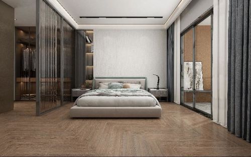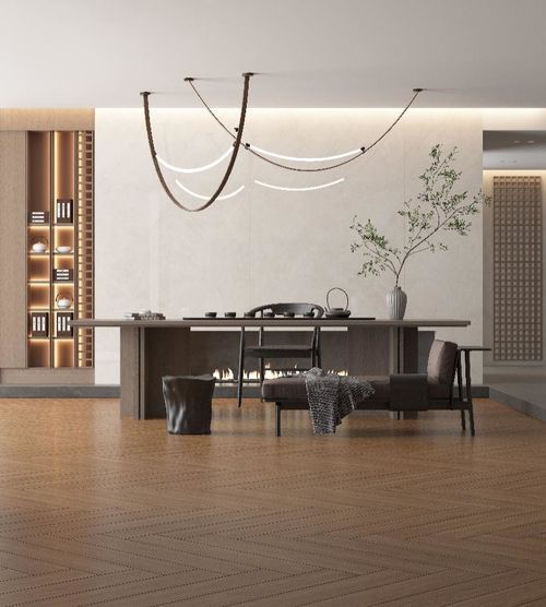應(yīng)用產(chǎn)品:云紗深灰、海南黃花梨-黃金棕 茶室運(yùn)用人字形拼木紋瓷磚,利用深色地板打造自然深邃的空間。幾何圖案為空間增加了線條感,簡單又大氣,綠樹盆栽的點(diǎn)綴,更是增添了空間的活力。