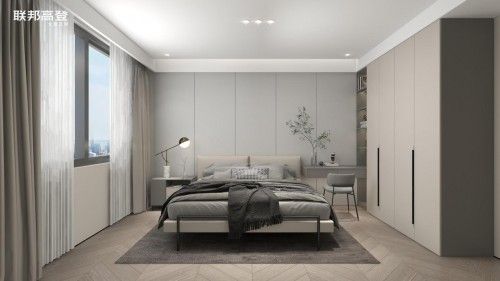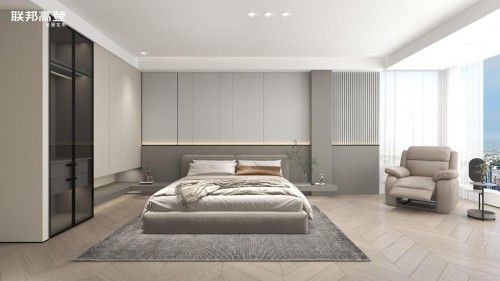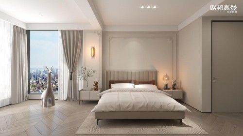 主臥遵循極簡(jiǎn)自然的舒適氛圍,采取適當(dāng)?shù)牧舭祝?yáng)光從落地窗揮灑而來(lái),明朗通透又舒緩愜意。