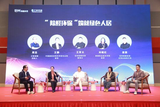 圖為中國(guó)建筑材料科學(xué)研究總院領(lǐng)導(dǎo) 王靜 接著,中國(guó)建筑材料科學(xué)研究總院領(lǐng)導(dǎo)王靜做《功能裝飾建材助力健康居住空間》主題演講。她表示,政策、標(biāo)準(zhǔn)以及消費(fèi)需求均引導(dǎo)產(chǎn)品向環(huán)保健康方向發(fā)展。企業(yè)端要滿足消費(fèi)端健康家居的需求,首先要遵循國(guó)家政策的引導(dǎo)。與此同時(shí),她還向現(xiàn)場(chǎng)的媒體嘉賓解讀了空氣負(fù)離子的益處、產(chǎn)生機(jī)制、種類,并公布了冠特新型功能板關(guān)于負(fù)離子誘生量測(cè)試、材料放射性測(cè)試、抗菌性能測(cè)試、家具漆面板凈化甲醛性能測(cè)試、家具漆面板揮發(fā)性有機(jī)含量測(cè)試、家具漆面板放射性測(cè)試以及健康家居聯(lián)盟涂料產(chǎn)品各項(xiàng)性能測(cè)試,檢測(cè)結(jié)果均為合格。 活動(dòng)上,王靜為冠特除醛家居董事長(zhǎng)王軍太授予了“中國(guó)建筑建材研究總院負(fù)離子標(biāo)準(zhǔn)”參編單位牌匾。冠特獲得這份榮譽(yù),不僅是權(quán)威機(jī)構(gòu)對(duì)其不斷完善與升級(jí)綠色環(huán)保標(biāo)準(zhǔn)的高度肯定,而且還將不斷推進(jìn)國(guó)家標(biāo)準(zhǔn)的實(shí)施和升級(jí),為中國(guó)家居行業(yè)環(huán)保發(fā)展添磚加瓦。從產(chǎn)品到文化到標(biāo)準(zhǔn),冠特除醛家居一步步夯實(shí)“除醛環(huán)保”的特有IP護(hù)城河,筑起國(guó)人的綠色人居! 03聚焦消費(fèi)需求—— 深入探討家居企業(yè)環(huán)保發(fā)展思路 在最后的論壇環(huán)節(jié),泛家居圈創(chuàng)始人周忠與冠特除醛家居董事長(zhǎng)王軍太、中國(guó)建筑材料科學(xué)研究總院領(lǐng)導(dǎo)王靜、順德職業(yè)技術(shù)學(xué)院教授劉曉紅、冠特除醛家居優(yōu)秀經(jīng)銷商代表梁勇一起,就“除醛環(huán)保筑就綠色人居”的主題進(jìn)行了更深入的探討。