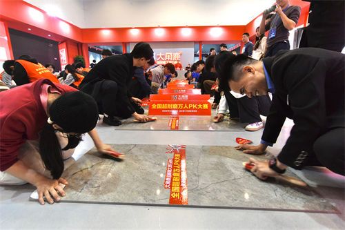 大角鹿展館遵循中國(guó)古建筑營(yíng)造法則,采集經(jīng)典的故宮紅色,融合了簡(jiǎn)約而出挑的造型,呈現(xiàn)堂皇端莊、宏偉壯觀的視覺效果。大角鹿本次展會(huì)重點(diǎn)展示的柔光磚,獨(dú)創(chuàng)“柔光肌膚”國(guó)家專利技術(shù),同時(shí)運(yùn)用了“超耐磨鉆石釉”技術(shù),解決了耐磨性和不易清潔的問題,高度迎合了高品質(zhì)家居生活人群的極致追求,吸引眾多領(lǐng)導(dǎo)嘉賓、媒體、消費(fèi)者、代理商前來參觀,成為晉江陶博會(huì)人氣王。 瓷磚好不好,磨磨就知道大角鹿超耐磨萬(wàn)人pk大賽燃爆晉江