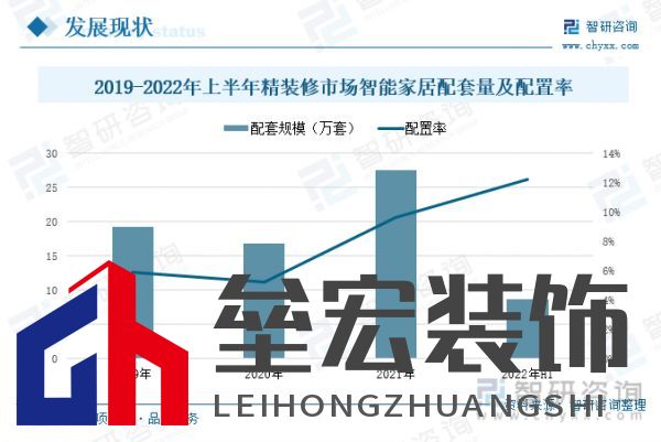 家居配置方面。2021年我國精裝修市場中智能家居配套規(guī)模共計27.5萬套,較2020年增長63.69%,配置率為9.6%。2022年上半年為8.61萬套,配置率達12.2%!