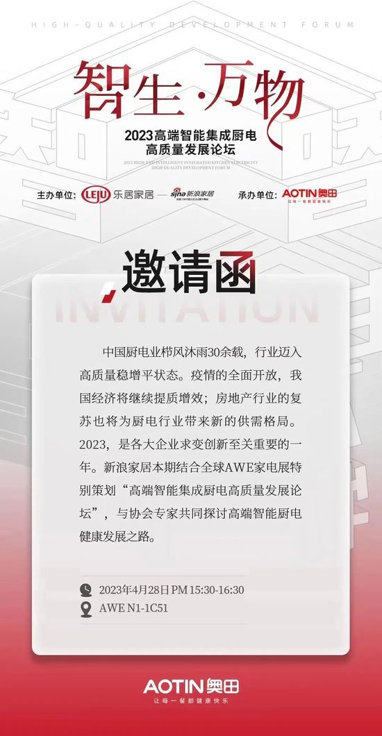 此次展會(huì)奧田還為大家?guī)砹司驶?dòng)活動(dòng),不間斷現(xiàn)場(chǎng)美食烹飪體驗(yàn);現(xiàn)場(chǎng)打卡分享白色集成灶,可獲得精美禮品更有機(jī)會(huì)贏千元大家,名額有限速速來打卡;4月28日下午3:30,聯(lián)合新浪家居,針對(duì)全球AWE家電展特別策劃“高端智能集成廚電高質(zhì)量發(fā)展論壇”, 奧田N1-1C51恭候大家蒞臨~ 責(zé)任編輯:songyuying |