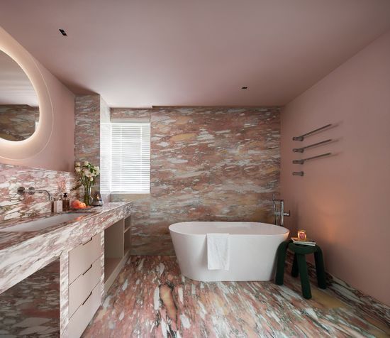 設(shè)計(jì)回歸需求 空間不被限制 “我喜歡在衛(wèi)生間喝咖啡。”柯沅伽語(yǔ)出驚人,但是當(dāng)你看到她的衛(wèi)浴間時(shí)便能完全理解。,這個(gè)以小眾大理石挪威紅和防水乳膠漆搭配打造的粉色獨(dú)立衛(wèi)浴空間,獨(dú)特而不張揚(yáng)、清爽又夢(mèng)幻。衛(wèi)生間秉持三分離功能特點(diǎn),不僅貌美,還兼具實(shí)用性。超寬的洗漱臺(tái)面可以安置她喜愛(ài)的各式香薰蠟燭與日常洗護(hù)用品。在獨(dú)享洗浴時(shí)能喝上一杯紅酒,泡澡時(shí)的閱讀都讓放松感油然而生。