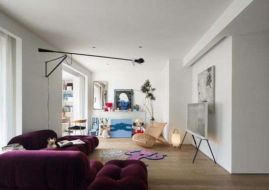 藝術(shù)在左,日常在右 當(dāng)代年輕人對潮流的追求從日常著裝逐漸侵入生活的方方面面,追求潮流似乎成為downtown青年的新興生活方式。在時尚領(lǐng)域,時裝的時效性成為衡量流行的標(biāo)準(zhǔn)。而在家居設(shè)計(jì)中,實(shí)用性和流行度需要平衡考慮、相輔相成。如何在家這個空間中營造出新鮮感就是當(dāng)下設(shè)計(jì)師們的課題了。 在與柯沅伽的交流中,她特別談到家中的無過道設(shè)計(jì),將客廳打造成一個完整的空間,家就是她心境的完全寫照。110平米的空間里每一處都是她精心挑選的心愛之物。客廳裝滿了自己喜歡的藝術(shù)品,家具和軟裝可以根據(jù)季節(jié)與心情隨意變化組合,任情緒自由流動,無拘無束。