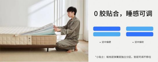 不僅如此,棲作在產(chǎn)品設(shè)計(jì)源頭,也堅(jiān)持將循環(huán)理念融入其中,持續(xù)關(guān)注原材料創(chuàng)新及環(huán)保材料的應(yīng)用?!复髱煛勾矇|正是這一理念的必然產(chǎn)物。 可持續(xù)滿足睡眠需求 「大師」床墊延續(xù)棲作一貫的特點(diǎn),做了全床可拆卸、墊層可調(diào)節(jié)設(shè)計(jì),可以滿足睡眠者不斷變化的睡眠需求。不論是長(zhǎng)時(shí)間加班后所需的護(hù)脊睡感,還是休閑玩樂后必要的釋壓睡感,都能在同一張床墊上實(shí)現(xiàn),具備極強(qiáng)的靈活性。即便后期睡眠需求發(fā)生變化,僅通過(guò)換墊層就能低成本匹配全新睡感,這種睡眠體驗(yàn)被棲作定義為“陪伴型睡眠”。
