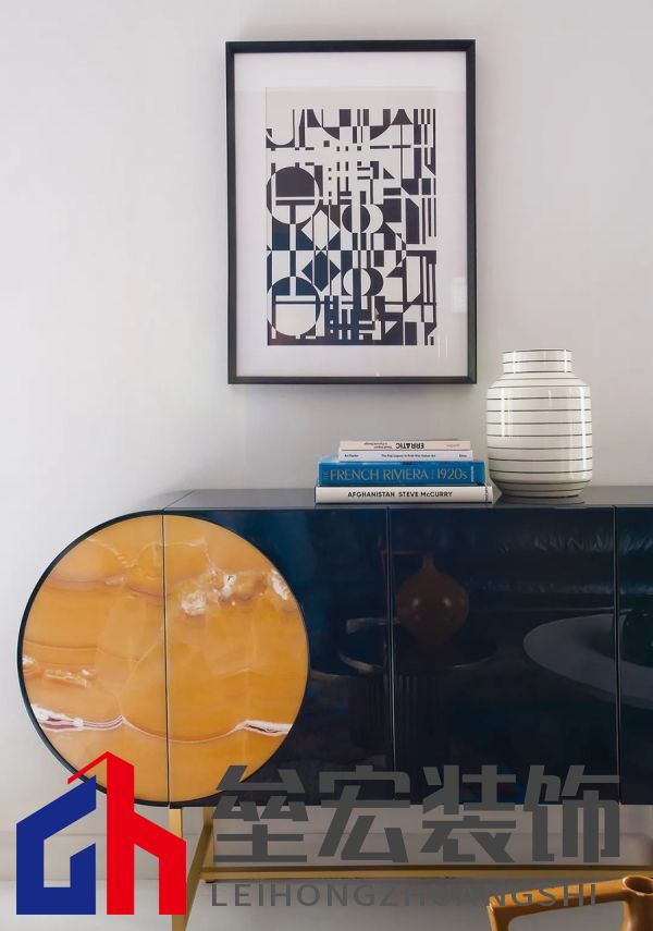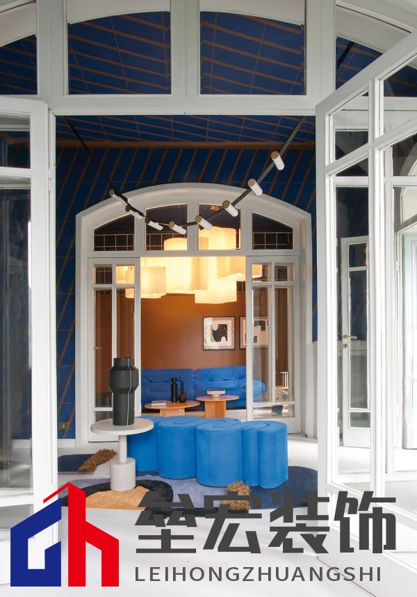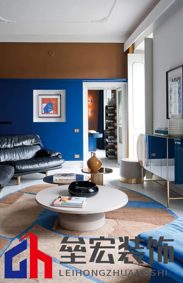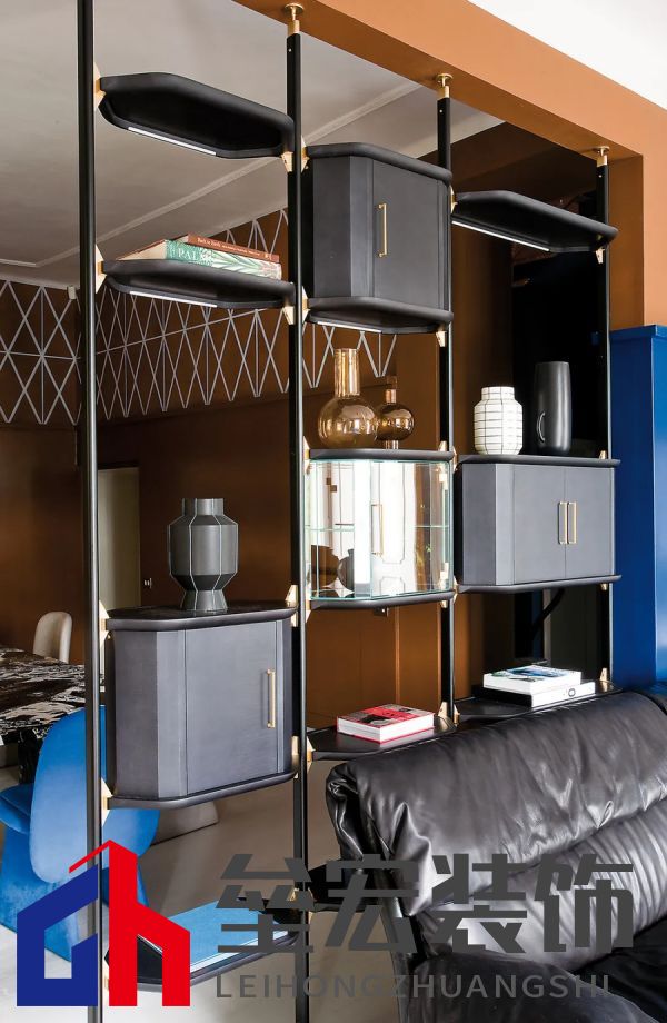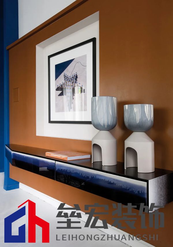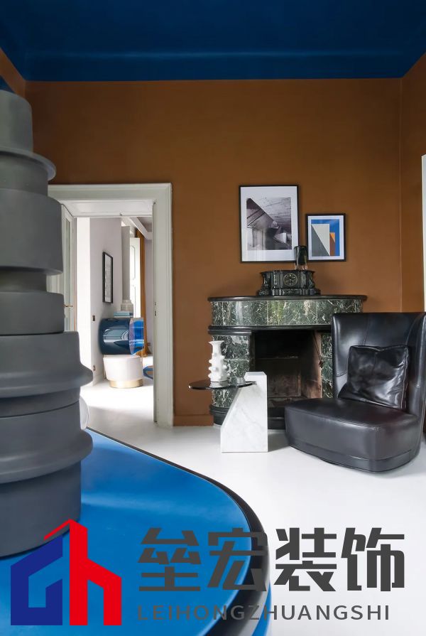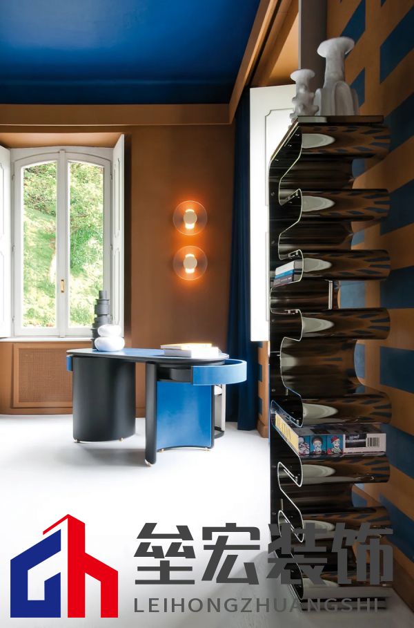 左圖:Hagit?Pincovici(Baxter?事務(wù)所)設(shè)計(jì)的?Selene?系列家具。 右圖:樹脂材質(zhì)的?Altea?置物架由?Draga&Aurel?設(shè)計(jì)(Baxter?出品)。 進(jìn)入別墅,映入眼簾的是乳白色的地板和飾有幾何圖案的手工紙墻壁。這種現(xiàn)代氛圍可能出人意料,但卻突出了對比鮮明的材質(zhì)以及為原有的皮革和飾面呈現(xiàn)出的明亮色調(diào)。在一樓,電光藍(lán)和干邑色與黑色相互交錯,疊加出圖案的感覺。特別是在門廳處,墻壁上的藍(lán)色和干邑色條紋斜向排列,在此襯托下,F(xiàn)ederico?Peri?設(shè)計(jì)的?Wave?燈具呈現(xiàn)出纖細(xì)靈動的輪廓,顯得格外突出。