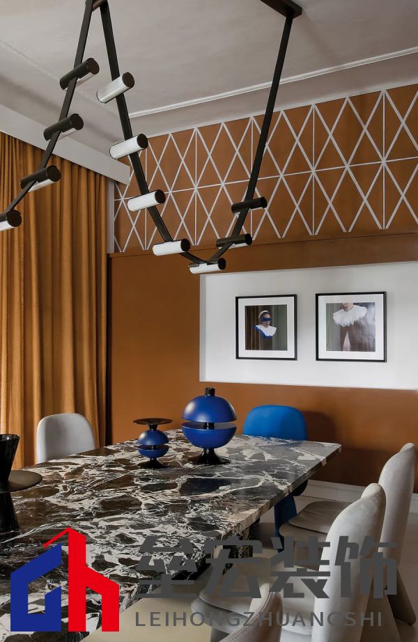 餐廳另一側(cè)擺放著使用奧貝爾村?Brushed?Grand?Antique?大理石制作的?Kate?餐桌和?Christophe?Delcourt?設(shè)計(jì)的?Jodie?餐椅。Wave?吊燈由?Federico?Peri?設(shè)計(jì)(均由?Baxter?出品)。