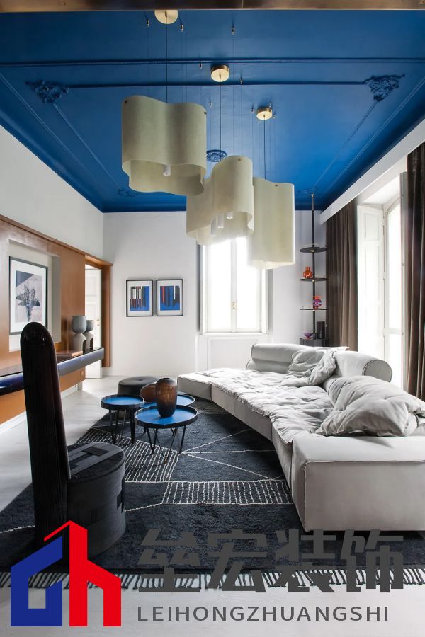 入口處的小客廳里擺放著?Adel?長凳、Pilar?邊桌、Federico?Peri?設(shè)計(jì)的?Wave?吊燈、Himani?地毯。背景中的大客廳中擺放著?Paola?Navone?設(shè)計(jì)的?Milano?長沙發(fā)和?Tebe?茶幾(均由?Baxter?出品)。