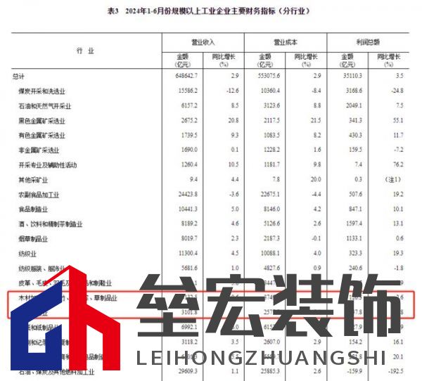 7月27日,國家統(tǒng)計局發(fā)布2024年上半年全國規(guī)模以上工業(yè)企業(yè)運行情況。 數(shù)據(jù)顯示,1—6月份,全國規(guī)模以上工業(yè)企業(yè)實現(xiàn)利潤總額35110.3億元,同比增長3.5%;營業(yè)收入64.86萬億元,同比增長2.9%;營業(yè)收入利潤率為5.41%,同比提高0.03個百分點。 分行業(yè)看,泛家居行業(yè)方面,1—6月份,全國家具制造業(yè)規(guī)模以上工業(yè)企業(yè)實現(xiàn)營業(yè)收入3101.8億元,同比增長5%;實現(xiàn)利潤總額137.8億元,同比增長3.8%。 1—6月份,全國木材加工和木、竹、藤、棕、草制品業(yè)規(guī)模以上工業(yè)企業(yè)實現(xiàn)營業(yè)收入4132.5億元,同比下降0.6%;實現(xiàn)利潤總額126.3億元,同比增長2.6%。