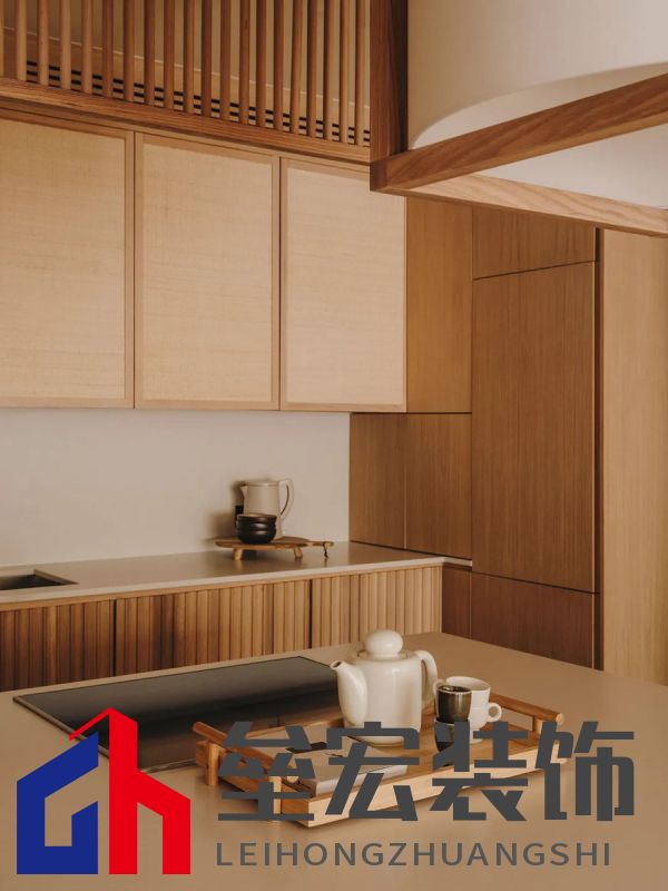開(kāi)放式廚房設(shè)計(jì)簡(jiǎn)潔而高效,強(qiáng)調(diào)實(shí)用性與美觀的結(jié)合。自然木材料的使用增強(qiáng)了溫馨感,提供一個(gè)舒適的烹飪環(huán)境。