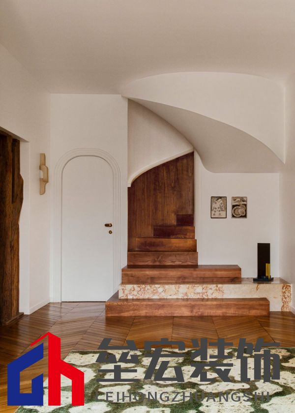 通往上層的樓梯,踏步與扶手一體,下方穿插一級石材臺階,顯得更有質(zhì)感。