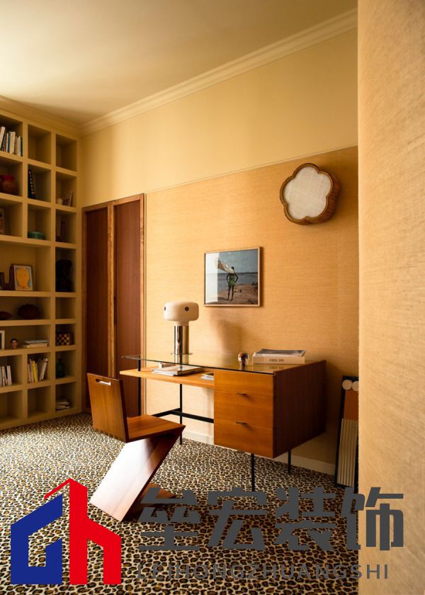 書房設(shè)計簡潔而高效,采用線性布局,一張極簡風(fēng)格的書桌搭配人體工學(xué)椅子,滿足日常工作和學(xué)習(xí)需求。墻面安裝了大面積的定制書架,用來擺放書籍和藝術(shù)品。