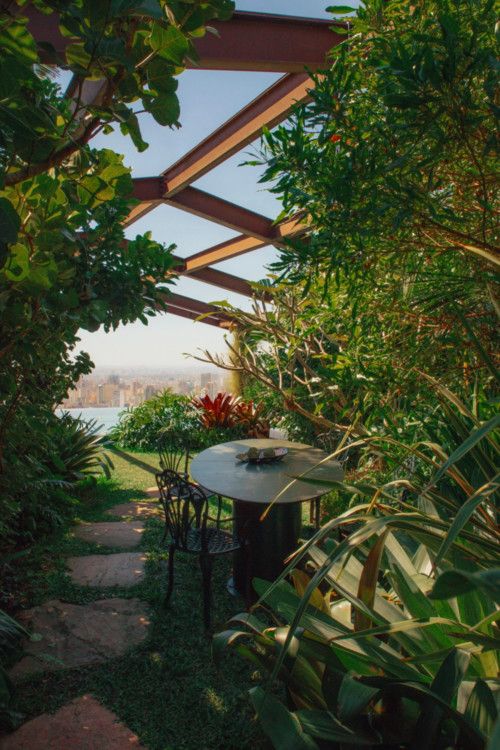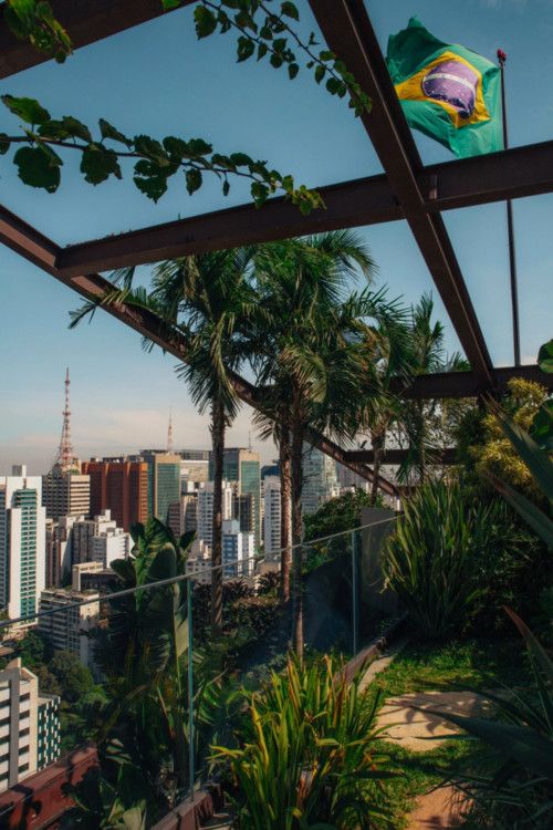在屋頂之上,經(jīng)由一條黑色的螺旋樓梯蜿蜒而上,便踏入了一個(gè)仿佛熱帶雨林的植物花園,石板小徑引領(lǐng)著通往隱秘的休憩座區(qū)與一處熱水浴缸。小路的盡頭是一個(gè)可以俯瞰保利斯塔大道的無(wú)限泳池,兩旁是引人注目的藍(lán)色、綠色和橙色石頭,四周被蔥郁的植物緊緊環(huán)抱。