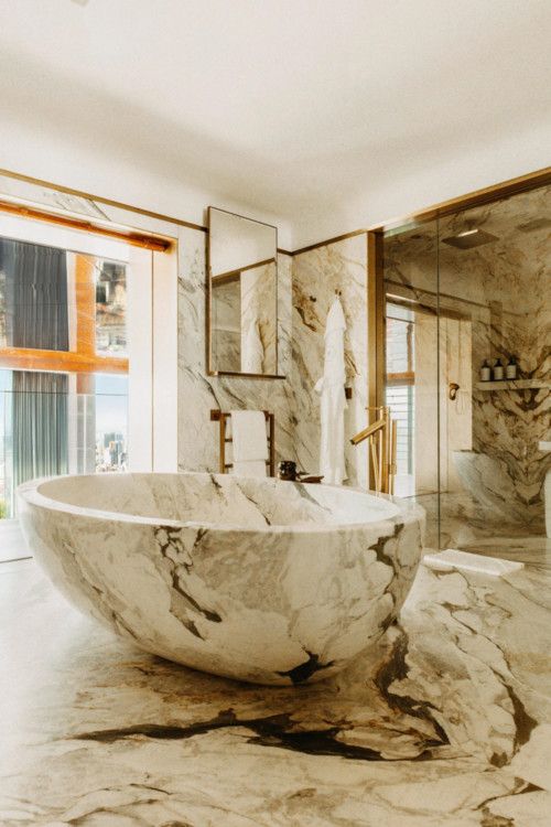 主套房大理石浴室合獨(dú)立的蛋形浴缸,通過(guò)夾層上的玻璃面板可以看到城市景觀。一條兩邊都有壁櫥儲(chǔ)物空間的長(zhǎng)走廊通向臥室,只需按一下按鈕,臥室就可以被電控遮光窗簾包裹起來(lái)。