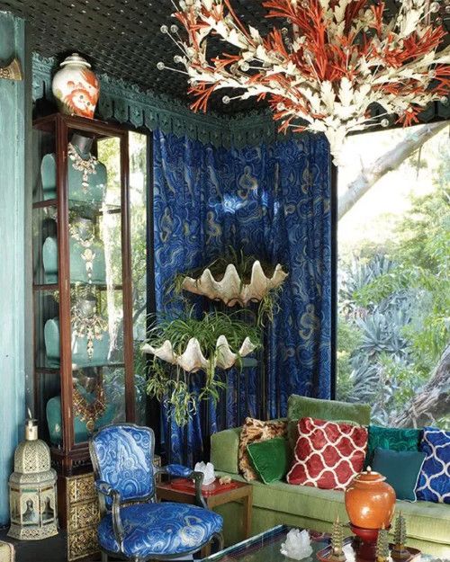 Wendy?Morrison的極繁主義之家,充滿幻想的東方元素。同時她還會在設計中考慮到風水方面知識,用以平衡空間的自然元素。 ? 極繁主義始終在物質(zhì)與精神的拉鋸戰(zhàn)中尋找平衡點。但設計中的繁復之美,絕非沒有章法的物質(zhì)堆砌,看似元素間撕扯拉鋸,可是暗藏邏輯在其中。 美學歷程螺旋上升,家的美學也一樣,所謂的節(jié)制與放縱永恒辯證,此刻不是永恒,但此刻的感受卻可以永恒存在。 極繁主義被重新“愛上”也許是因為寡淡久了希望換種風格,也或許真的是厭惡了所謂的條框與冰冷的舒服,想要尋找真正的自我。 極繁主義強調(diào)“大膽、豐富、層次感”,通過色彩、圖案、材質(zhì)和裝飾品的疊加,打造充滿個性與視覺張力的空間。 但極繁主義不是毫無頭緒的,無論多豐富的空間里,依舊是能在其中找到視覺核心,其他的存在皆是圍繞而而生的,而在混搭中的調(diào)性上的一致,也是保證more?is?more能夠真的實現(xiàn)美的關鍵,你會發(fā)現(xiàn)暗藏在其中的主線,些許的留白,更是那神來之筆。 01° 出挑的色彩 豐富、層次、點睛 說起極繁人們80%都會先想到色彩,或許是高飽和度的,也可能是對比強烈的色彩組合,如寶石藍、祖母綠、深紅、亮黃等,多種撞色也經(jīng)常會出現(xiàn)。 我們還可以看到在墻面、家具、軟裝的色彩疊加,產(chǎn)生豐富的視覺層次感,也有在基礎色調(diào)中加入小面積跳色來制造視覺焦點。