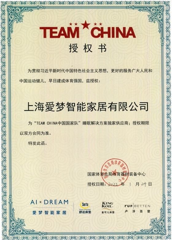 2022年1月24日,愛夢集團(tuán)攜旗下Serta舒達(dá)、KINGKOIL金可兒、RUF Betten盧浮百登三大品牌,獲得國家體育總局體育器材裝備中心授權(quán)許可,正式成為TEAM CHINA中國國家隊(duì)睡眠解決方案獨(dú)家供應(yīng)商,為70余支單項(xiàng)國家隊(duì)隊(duì)伍和運(yùn)動(dòng)員提供智能睡眠寢具、深度睡眠解決方案。