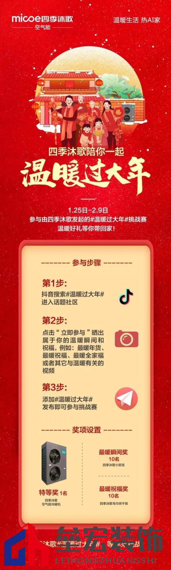??喜迎新年,暖字當先。在辭舊迎新的隆冬時節(jié),一切自然都要圍繞著一個“暖”字展開才應節(jié)應景,#溫暖過大年#顧名思義更是如此,不僅參與方式緊扣“暖”字,獎項設置更是與“暖”字息息相關。在1月27日-2月9日活動期間,所有參與者都將有機會獲得不同獎項,最暖瞬間獎10名,各獎勵四季沐歌小廚寶一臺;最暖祝福獎10名,各獎勵四季沐歌毛巾烘干架一臺;而作為令人矚目的特等獎得主,則將獲得四季沐歌空氣能冷暖機一臺。年味隨暖心而升溫,新春禮贈種種福利,自上線以來,#溫暖過大年#抖音區(qū)域挑戰(zhàn)賽引得眾多抖音達人紛紛種草,廣大參與者的熱情更是掀起了一波新的高潮。