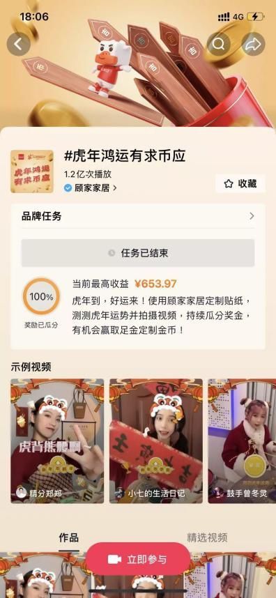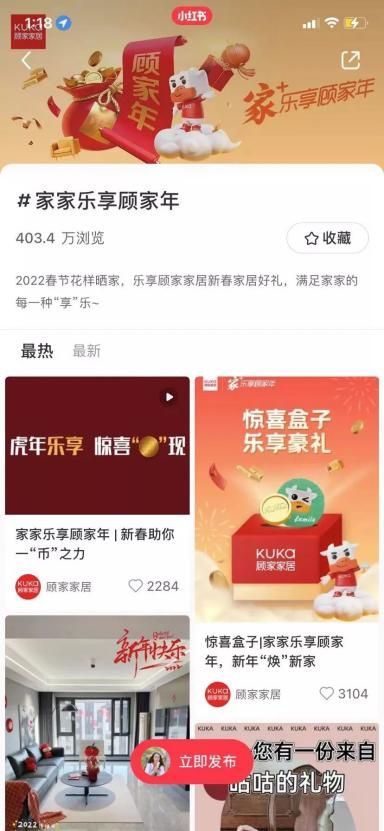 ??金幣領(lǐng)取的方式也非常多元化,“金幣小游戲”、看直播、秀生活、曬愿望等等,年輕人們可以在微信、抖音、小紅書、微博等平臺(tái)獲取金幣或其他禮物。 ??其中,顧家家居在抖音發(fā)起全民任務(wù)“#虎年鴻運(yùn) 有求幣應(yīng)”,話題累計(jì)1.2億次播放。在小紅書,話題“家家樂享顧家年”短時(shí)間內(nèi)收獲了超過 4494萬次曝光,513.5萬次瀏覽,大批年輕人被吸引而參與其中。