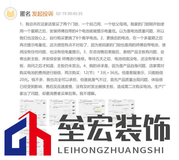??一位消費(fèi)者在2月19日的投訴中將自己的遭遇可以說(shuō)寫(xiě)的非常詳細(xì),他提到自己在凱迪仕品牌購(gòu)買了兩把門(mén)鎖,一把自用,一把給父母用,正可謂沒(méi)有對(duì)比就沒(méi)有傷害。自用的一把從安裝開(kāi)始就已經(jīng)出現(xiàn)了電量不正常的現(xiàn)象,經(jīng)過(guò)短暫的使用加之與父母使用的同款產(chǎn)品之間的對(duì)比,更加確定了產(chǎn)品本身的質(zhì)量問(wèn)題。當(dāng)然,產(chǎn)品出現(xiàn)質(zhì)量問(wèn)題是令這位消費(fèi)者苦惱的很大的原因,但更令他氣憤的則是與客服之間的溝通以及品牌在處理問(wèn)題時(shí)的效率。