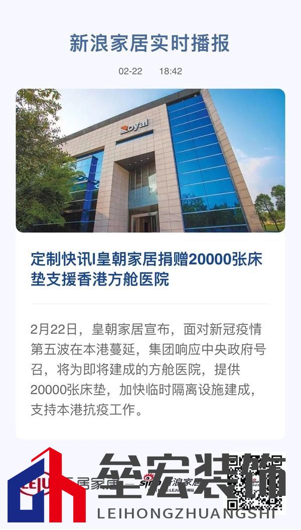 ???新浪定制頻道訊 2月22日,皇朝家居宣布,面對(duì)新冠疫情第五波在本港蔓延,集團(tuán)響應(yīng)中央政府號(hào)召,將為即將建成的方艙醫(yī)院,提供20000張床墊,加快臨時(shí)隔離設(shè)施建成,支持本港抗疫工作。