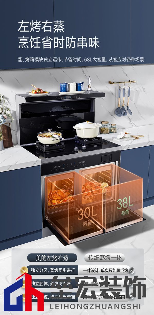 在千篇一律中尋找突破,在解決方案中覓得最優(yōu)。美的新品LS5則另辟蹊徑,首次采用頂側(cè)雙吸煙口設(shè)計,9+1黃金吸力分配,形成隱形油煙隔離倉,側(cè)面吸煙口率先吸走90%的油煙,頂部吸煙口再吸走10%的殘留逃逸油煙。 “上攏吸,下近吸”,黃金25-40CM低空近吸油煙+900MM寬域進煙距離,再配合21m3/min的極速大風(fēng)量,讓油煙剛產(chǎn)生的瞬間就被阻隔和吸走,油煙吸凈率接近100%,真正做到源頭阻擊,油煙不逃逸。 第二招:雙腔蒸烤高效率的烹飪體驗 中國人廚房普遍偏小,所以集成灶的集成屬性發(fā)揮了多種電器“合體”的功效。這也讓蒸烤一體集成灶逐漸流行。 但是從一些消費者反饋的信息來看,蒸烤一體集成灶由于共用一個腔體,既要承擔(dān)蒸箱的勞動,還要盡到烤箱的義務(wù),容易造成食物串味,味道跑錯“片場”;此外,因為不同食材對于加熱功率的特殊要求,蒸烤一體集成灶烹飪效率相對更低,倘若需要較短時間內(nèi)完成多道蒸烤菜肴的烹制,有些菜就只能“排隊等待”。