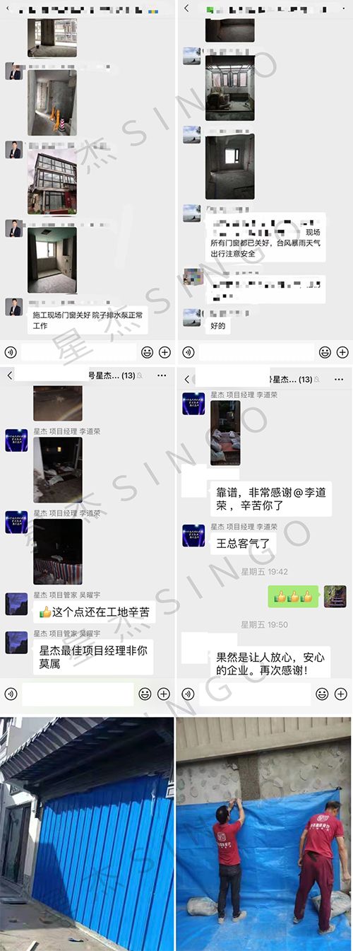 ??2021年7月,強(qiáng)臺(tái)風(fēng)“煙花”登陸前一周,為確保每位客戶家的安全,星杰工地現(xiàn)場積極開展臺(tái)風(fēng)防御措施,為客戶新家筑牢“安全結(jié)界”。 ??臺(tái)風(fēng)登陸時(shí),星杰每個(gè)工地現(xiàn)場負(fù)責(zé)人都要現(xiàn)場巡檢,實(shí)地拍照,還有相應(yīng)人員在工地值守,以防突發(fā)事件。