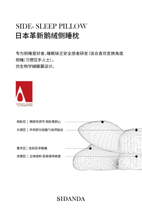 仿生學(xué)蝴蝶翼設(shè)計,為頭部提供溫暖包裹與安全感。分體式設(shè)計更充分考慮到側(cè)睡時常見的壓手問題。使用者可以輕松將手插入枕頭間的縫隙,避免長時間把手壓在頭下導(dǎo)致的酸麻、疼痛。 再一次摘得世界級設(shè)計大獎,是對SIDANDA堅持深耕睡眠美學(xué),不忘初心的高度肯定;也是激勵品牌持續(xù)創(chuàng)新,大膽解構(gòu)的不竭動力。