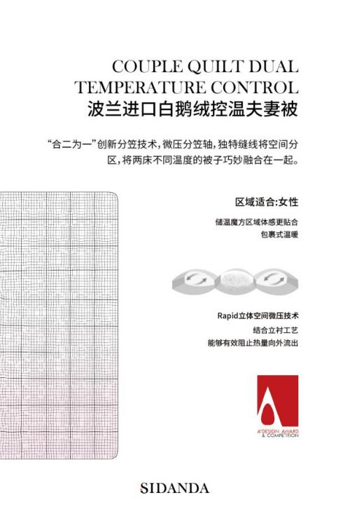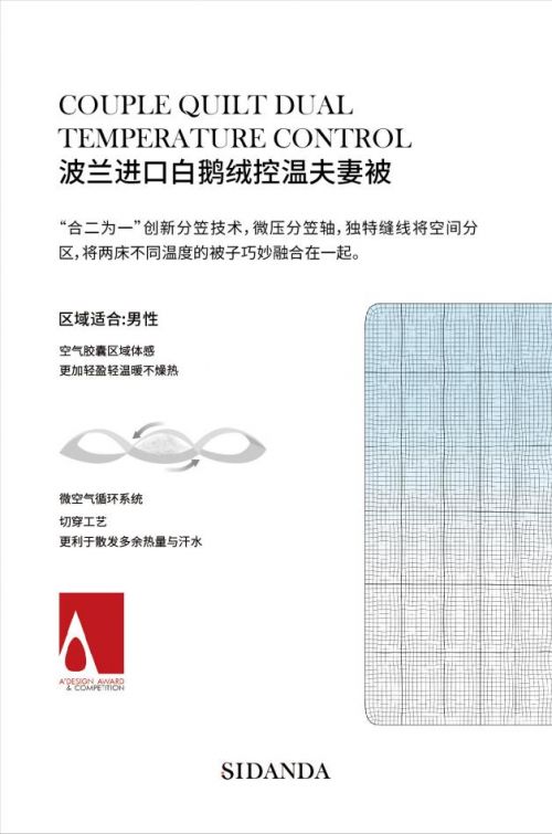 “波蘭進(jìn)口95白鵝絨控溫夫妻被”是SIDANDA針對夫妻同床一被時,男女雙方對溫度的感知不同,且有可能因翻身漏風(fēng)而困擾的情況開發(fā)。產(chǎn)品真正實現(xiàn)一床被子兩種溫度的雙區(qū)控溫,根據(jù)兩性之間新陳代謝的不同,達(dá)到相互舒適的目的。