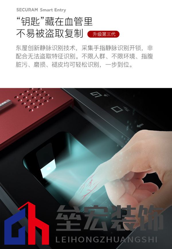 一些門鎖專家認為,“智能識別鎖在算法技術(shù)上,確實存在很大的提升空間。更加智能的算法,可以顯著降低門鎖產(chǎn)品‘誤判’的可能性,將安全風險盡量減少至最低限度。” 在這樣的市場環(huán)境下,靜脈識別鎖成功被研制而出,并且憑借著高效、安全的解鎖模式,迅速在智能門鎖領(lǐng)域“稱王稱霸”,取得了無數(shù)消費者的由衷青睞。 從生物學(xué)的層面上來看,靜脈識別的方式要更加穩(wěn)妥、更加安全一些,因為靜脈的生物識別特征在體內(nèi),處于人體靜脈血管當中,幾乎不會受外界任何因素的影響,具有穩(wěn)定性、唯一性、更加安全的特征。也就是說,靜脈識別不會出現(xiàn)磨損過度的狀況,深埋在人體靜脈血管里,是天然的“血脈鑰匙”。