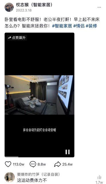 近日一款來自趣睡科技的智能電動床火爆某短視頻平臺,發(fā)布幾天時間點贊量已上百萬,評論量也近十萬。