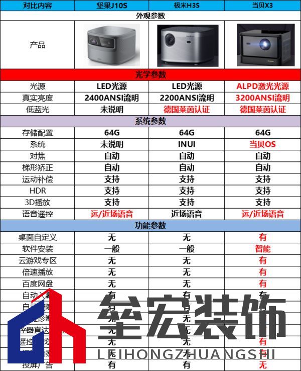 ??極米H3S和堅果J10S作為2款亮度接近的LED投影儀,經常被網友們進行對比,有像堅果J10S和極米H3S哪個好值得推薦看,極米H3S對比堅果J10S哪款更值得選擇購買等相關問題,今天呢大神不只是對這2款LED投影儀進行介紹,這回加上同樣價位的熱銷當貝X3激光投影儀,有一個更全面對比。 ??參數區(qū)別 ??首先,老習慣分享一張圖表,一圖了解3款投影儀各自特點,網友可以更清晰看出區(qū)別來,然后詳細說說。