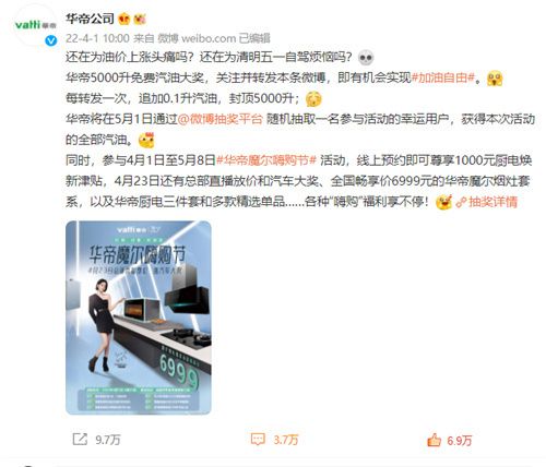 華帝#加油自由#官方微博活動資料顯示:華帝承諾,只要關(guān)注華帝官方微博并轉(zhuǎn)發(fā)該活動話題,每轉(zhuǎn)發(fā)一次,華帝追加 0.1 升汽油,封頂 5000 升(價值49500元),相當豪橫!華帝將在 5 月 1 日通過微博抽獎平臺隨機抽取一名參與活動的幸運用戶,獲得本次活動的全部汽油,想要實現(xiàn)“加油自由”的小伙伴們,絕對不容錯過! #加油自由#是華帝魔爾嗨購節(jié)活動中的一個福利,該活動于4月1日啟動,截止5月8日?;顒悠陂g,用戶線上預約即可尊享 1000 元廚電煥新津貼、華帝魔爾煙灶套系全國暢享價只要6999 元等福利;此外,4月23日華帝魔爾嗨購節(jié)還將啟動“總部直播放價抽汽車大獎”活動,包括1元搶購,千元補貼、萬元紅包、超值加贈、汽車大獎等一系列“嗨購”福利……