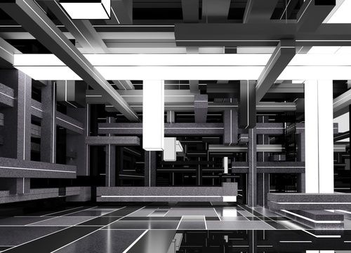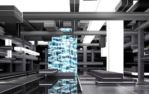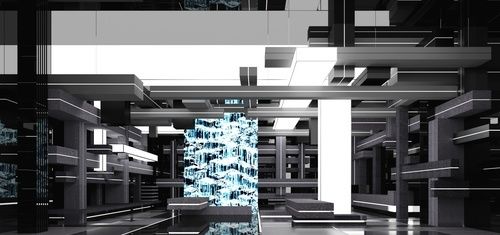 A3:覃思:在表現(xiàn)手法上,我們主要是利用石材的塊狀特點(diǎn)讓石材在空間中進(jìn)行融合、交錯、穿插來呈現(xiàn)一種虛實(shí)相間的場景。同時,空間中運(yùn)用的LED屏及內(nèi)嵌線燈、地面和天花的鏡面材質(zhì)放大主體的視覺沖擊力,為整個空間營造出具有未來感和虛擬感的思維場景。