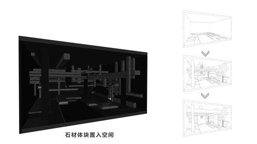 “一念”表示擁有稍縱即逝的破碎感,更具有唯心永恒“遍及十方”的速度、力量和體量。運(yùn)用石材塑造體塊將抽象意識形態(tài)與具象的石材空間融合、交錯、穿插,以形釋意。