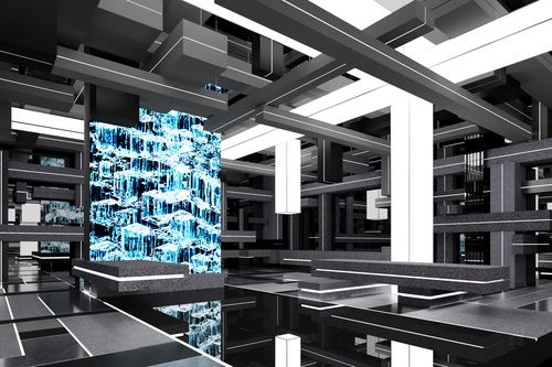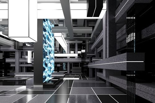 此次展廳的主題是十方一念。唯有一念,遍及十方,表達(dá)設(shè)計師的禪宗態(tài)度?!耙荒睢睋碛猩钥v即逝的破碎感,更具有唯心永恒“遍及十方”的速度、力量和體量。運(yùn)用石材塑造體塊將抽象意識形態(tài)與具象的石材空間融合、交錯、穿插,以形釋意。 空間中運(yùn)用的LED屏及內(nèi)嵌線燈、地面和天花的鏡面材質(zhì)放大主體的視覺沖擊力,為整個空間營造出具有未來感和虛擬感的思維場景。同時,在介于虛與實(shí)之間,為觀者帶來一場正在進(jìn)行中的思維蔓延。
