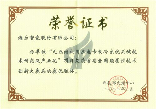 (海爾智家獲首屆全國(guó)顛覆性技術(shù)創(chuàng)新大賽優(yōu)勝獎(jiǎng)證書(shū))