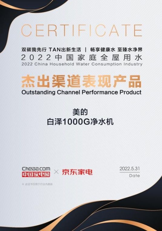 作為家庭全屋用水領(lǐng)域的領(lǐng)軍品牌,美的積累了大量的研發(fā)資源和渠道資源。此次,美的廚熱2個杰出渠道表現(xiàn)產(chǎn)品大獎,對應(yīng)的產(chǎn)品分別為美的白澤1000G凈水機、美的電熱水器F6032-UD(HE)。