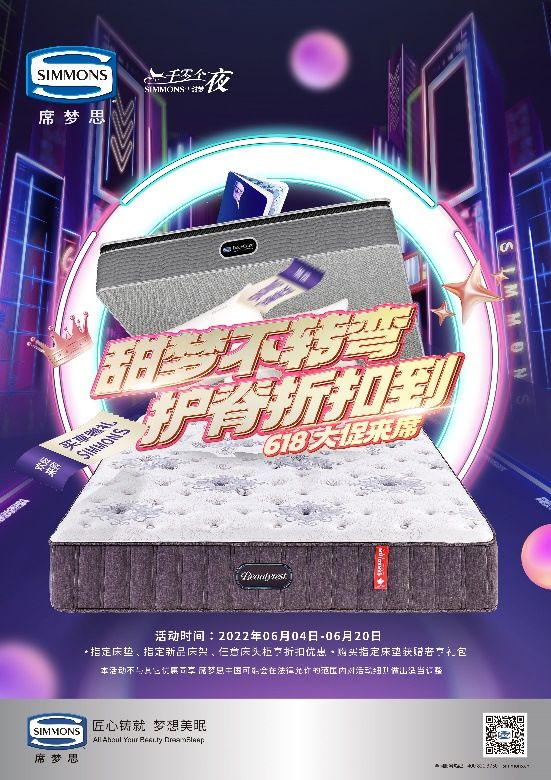 ??百年探索與沉淀讓Simmons席夢(mèng)思發(fā)展為聞名全球的床墊品牌,以品質(zhì)和口碑深獲用戶信賴。核心技術(shù)“Beautyrest甜夢(mèng)獨(dú)立袋裝彈簧科技“,每顆彈簧能單獨(dú)伸縮,完全順應(yīng)人體曲線,承托身體各個(gè)部位,讓人體各部位感受到均勻的支撐與回彈,舒緩緊繃的肌肉,讓人快速進(jìn)入深沉的熟睡狀態(tài);特殊的彈簧形狀,能有效減低因睡姿轉(zhuǎn)換產(chǎn)生的震動(dòng),減少同床伴侶翻身所帶來(lái)的干擾,享受整晚舒心優(yōu)質(zhì)睡眠。 ??BackCare護(hù)脊系列針對(duì)亞洲人身形而設(shè)計(jì),通過(guò)對(duì)亞洲客戶睡眠需求的深刻洞悉和不斷探索,結(jié)合這一區(qū)域的氣候情況、人群的睡眠環(huán)境、睡感喜好,量身定制產(chǎn)品,以品牌核心科技全方位的為用戶修復(fù)身心。 ??618年中大促限時(shí)開搶,Simmons席夢(mèng)思兩大床墊系列:Beautyrest甜夢(mèng)系列和BackCare護(hù)脊系列,全線享折扣,再疊加贈(zèng)品!以護(hù)脊甜夢(mèng),開啟全新睡眠體驗(yàn)!